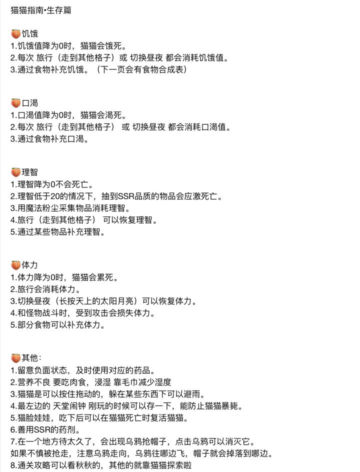 含生存篇、合成表、通关篇生存问题生存食谱以下内以下内容非本人制作:(欢迎加群讨论喵,游戏内可以入群)合成表(秋秋大佬整理&笙念.大佬整理)秋秋大佬写的通关方法攻略
