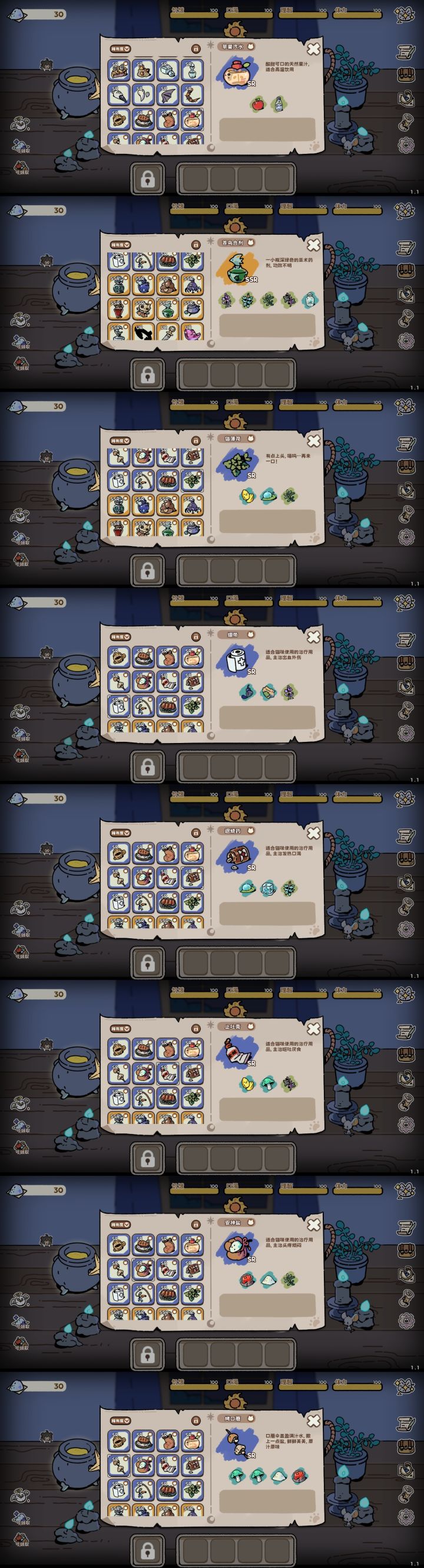 露水+盐+细口瓶=盐汽水补充饥渴值与精神值,再加一只苹果可以合成苹果汁布+布=粗制毛巾减少20点湿度(雨天必备),建议:看到雨云把小猫拉到树荫下,湿度不会增加(但切换日夜还是会涨点)种子+露水+熔岩+羽毛+石头=末影之眼不借助npc寻找碎片的道具,使用指出魔法方向(比如东南),等魔法方向在‘身边’的时候使劲探索,直到找出水晶球碎片就可以了冰块/露水+种子+熔岩=杂粮粥补充饥渴值与饱食