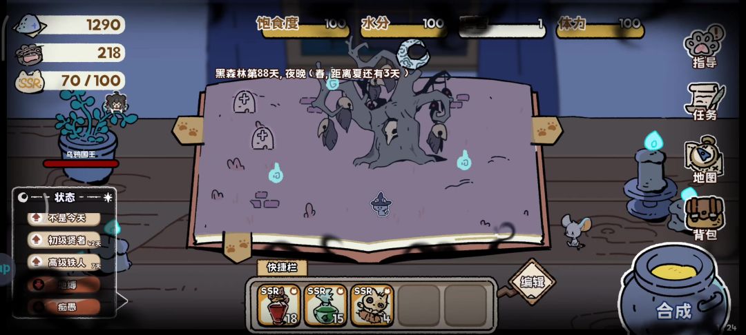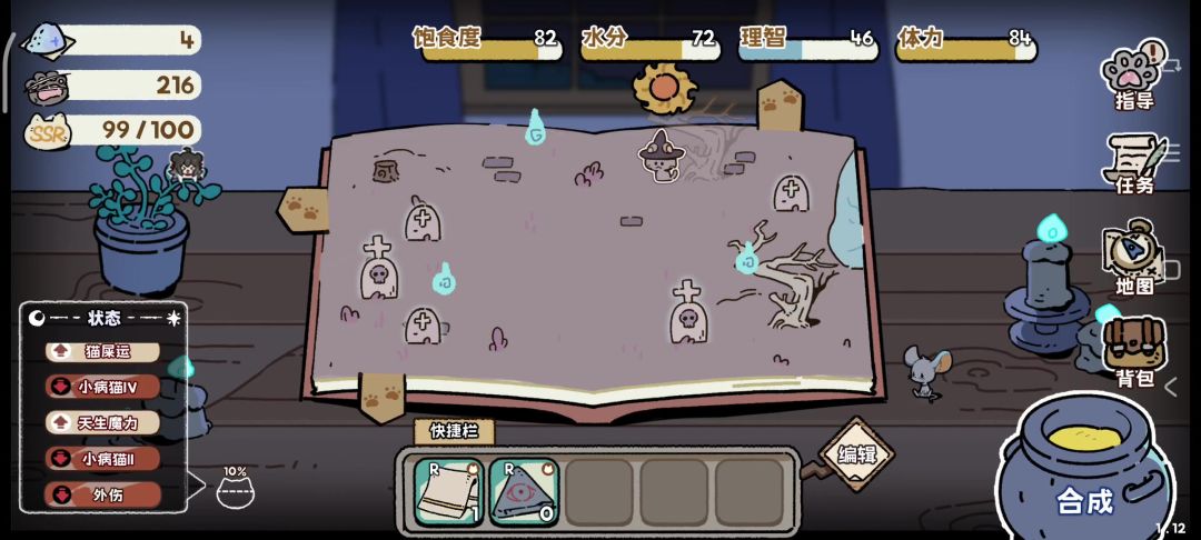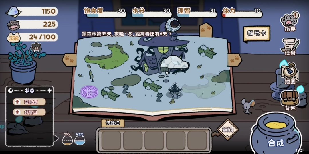 本条视频内容指导:一只小思慕 抽卡猫咪是一款单机独立游戏,玩家需要带领自己的小黑猫探索魔法书中的女巫森林。在游戏中,玩家通过抽卡获得N、R、SR、SSR等卡片来生存。同时,玩家可以利用炼金术合成更高级的道具来提升自己的能力。 游戏的核心内容是地图探索和抽卡。在开局时,玩家可以选择不同的天赋,并且还有四维属性设定。如果任何一个属性归0,游戏就会结束。因此,玩家需要时刻注意自己的生存压力。 游戏中的所
