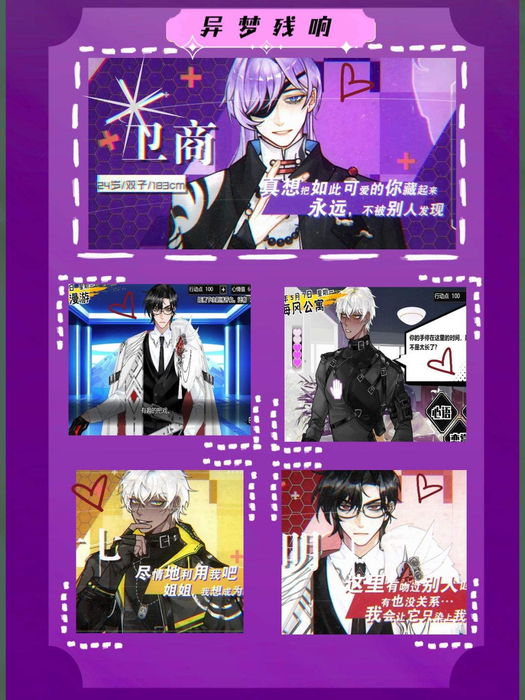 《异梦残响》 全部都攻略一遍[表情_狗头][表情_狗头] 好爱好爱 ★共通线全剧情(若偏好纯剧情,进入自由探索阶段后,点击【休整】按钮,即可快速跳天,推进剧情触发) ★所有可攻略角色(0-60)好感度触摸➕约会玩法内容(可以在恋赏中查看全部可探索内容,不用担心错过与他的一切哦[表情_送花]) ★可攻略角色全员随机探索剧情*3(多在各地逛逛,既有几率触发~) 终于要来了!!值得祝贺! #游戏种草计
