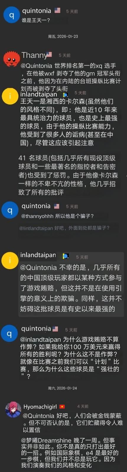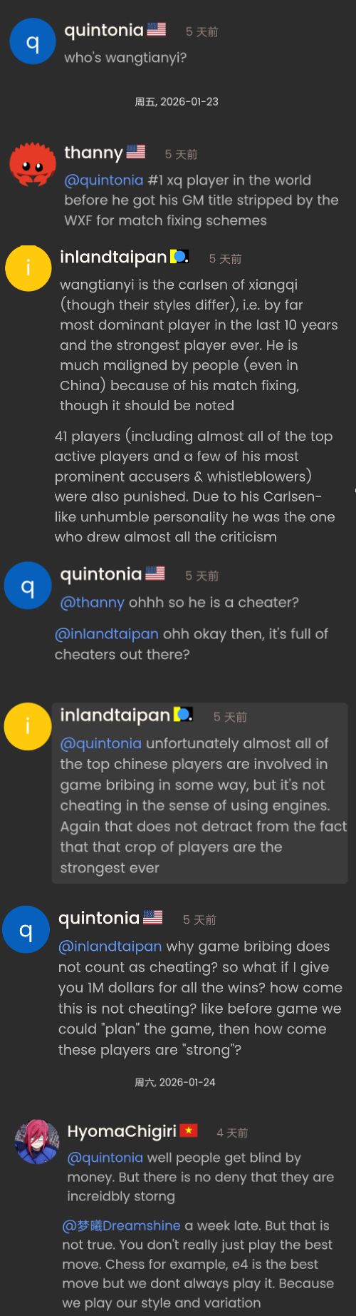 #录音门事件 是发生在中国 象棋比赛的买卖棋事件,影响极其恶劣,中国本代几乎所有顶级职业棋手入狱。 2025年,象棋世界锦标赛由 越南人「赖理兄」夺冠,同时也首次打破中国人在中国象棋世锦赛稳居第一地位。 “谁是王天一?”一位刚学习象棋的美国人如此问道。 “王曾是中国xq第一人,也是世界xq第一人”另一位美国人回答。 “事实上,他们只是涉及操纵比赛,象棋实力依然不容质疑”“这一代棋手展现出碾