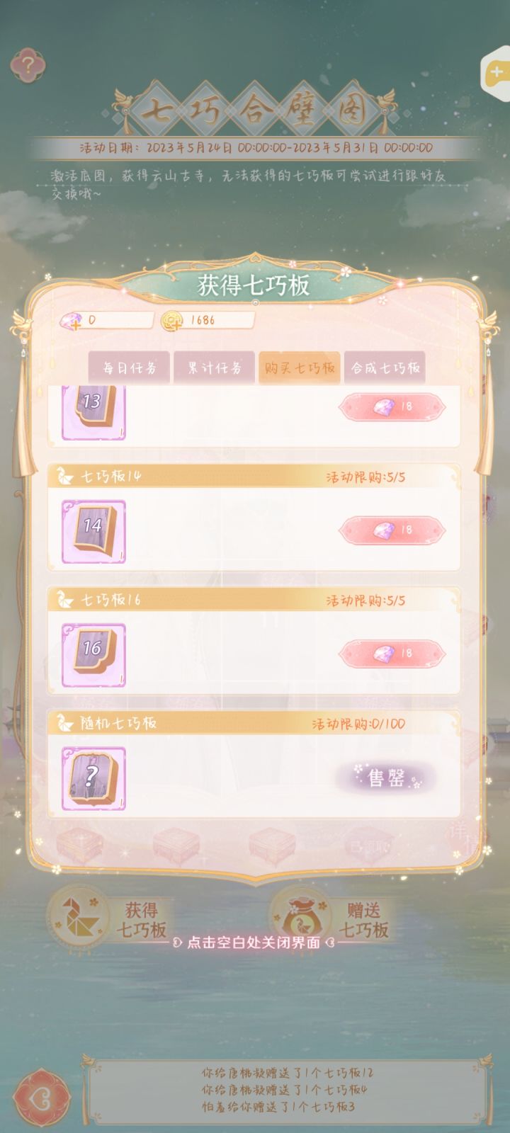 金币的100次买满了,花了两千多金币,100阁七巧板,愣是开不到一个1,11,13,14就这,概率这么低,你怎么敢的啊?😅