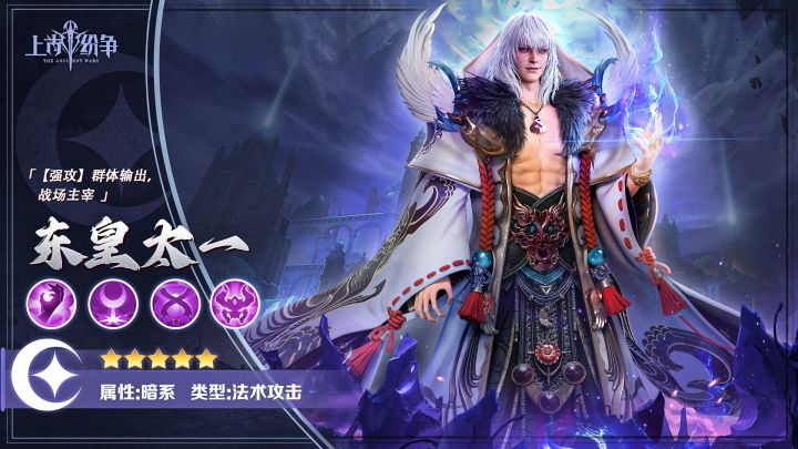 上古英雄:东皇太一品质:SSR法术攻击型、暗系(对光系克制20%,受光系伤害-10%)定位:【强攻】群体输出,战场主宰技能介绍:暗冕之噬:对前方直线上的单位造成189%法术总伤害,该伤害由所有受击单位承受,对单个单位的伤害不超过119%,60%附加[诅咒]2回合;并使随机1个目标获得[嗜灵]2回合日蚀祭典:攻击提升17.5%,生命提升12.5%,防御提升12.5%曜龙烛兆:对敌方全体