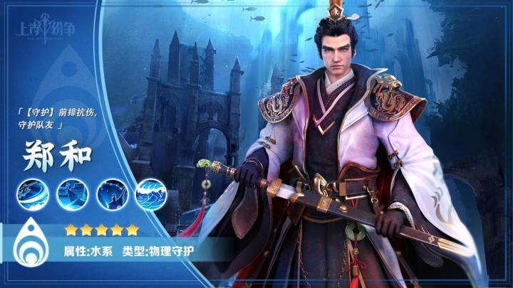 上古英雄:郑和品质:S星级:☆☆☆☆☆物理守护型、水系(对火系克制20%,受火系伤害-10%)定位:【守护】前排抗伤,守护队友技能介绍:逐浪:随机对敌方1个单位造成162%物理伤害,20%概率附加[眩晕]1回合,优先攻击刺客职业,对刺客的[眩晕]概率为45%宝船:攻击提升10%,生命提升20%,防御提升20%护航:为己方攻击最高的1个单位附加[援护]同时清除目标所有负面状态,并为自
