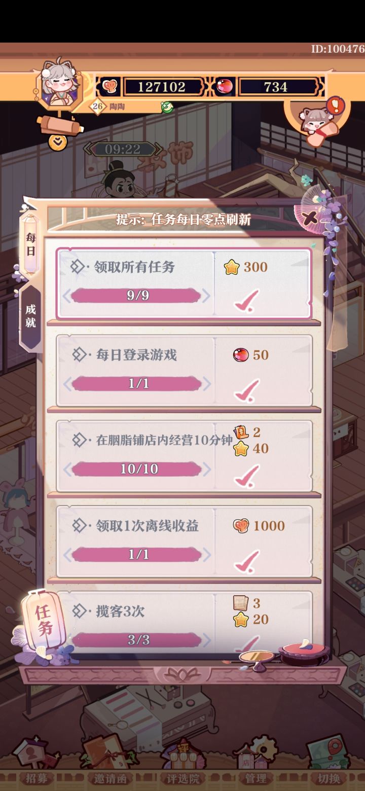 游戏一直开着,零点过了任务也没刷新。评选院今天明明没参加,非说我参加过了。
