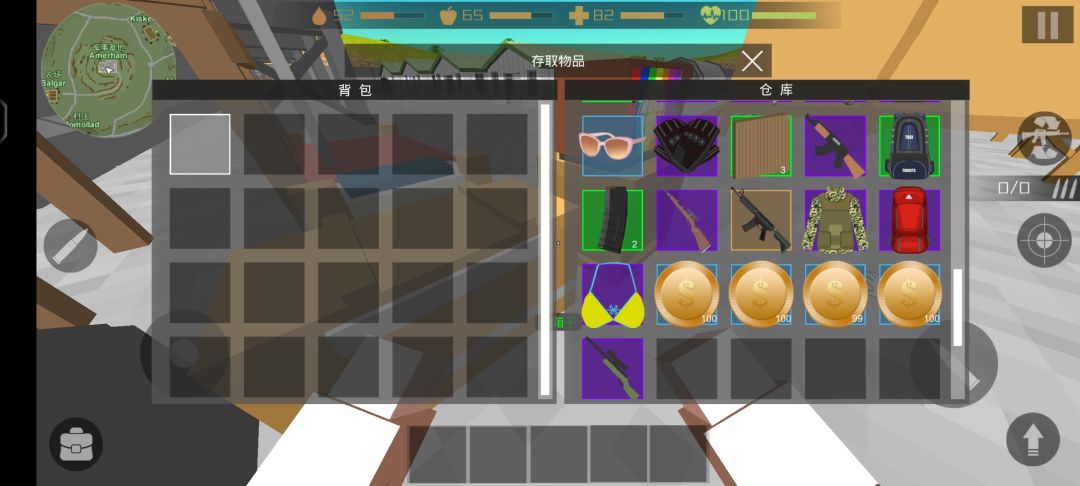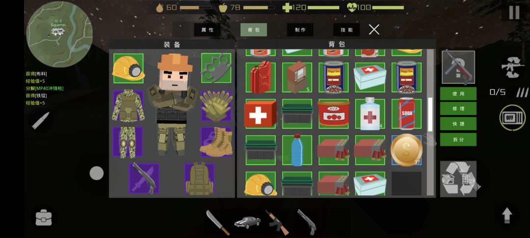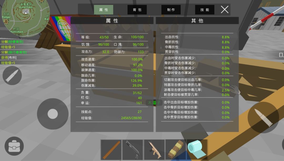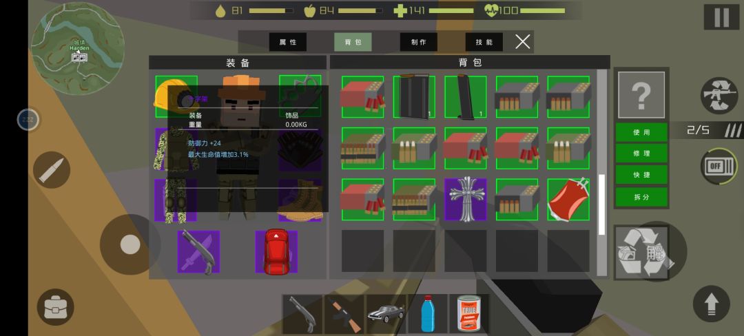 在这里告诫大家一定要把好的装备留在箱子里,需要用到的时候再穿,比如攻打怪物多的地方,想轻松攻打军事基地,可以在中间建一个比较高的建筑怪物就不会理你。虽然我有良策,但是我背包里的一堆木头没了,辛辛苦苦伐了一个小时的树😭不过背包的问题老是解决不掉,穿上了就拿不下来了,希望作者再加一点天气和白天夜晚,还有夜晚的僵尸更多更活跃,野外也有游荡的亡灵,就更刺激了