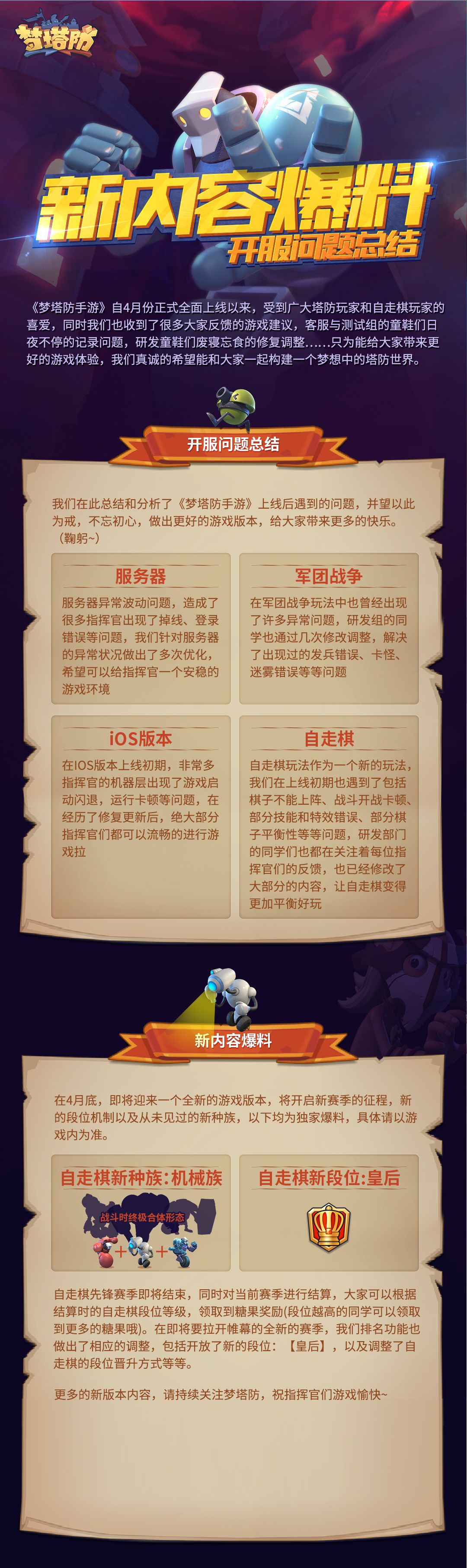 亲爱的指挥官 《梦塔防》手游计划于2019年4月26日5:00-8:00进行版本更新,此次为停机更新,停机期间将无法登录游戏,请大家妥善安排好游戏时间,维护结束后,我们会奉上水晶*60、铭文碎片*60作为本次更新奖励,可在更新后登录游戏领取 新版本中将加入了全新的自走棋种族-机械族 机械族:场上存在3种机器人时,开战时所有机器人合体,随机出现一个S型合体机器人,机械族共包括3个全新棋子单位: 零件