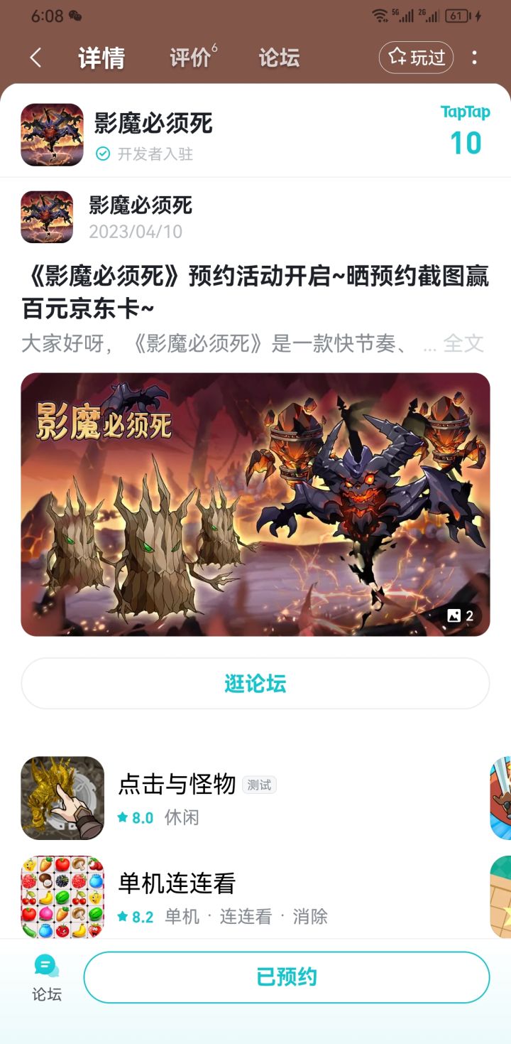 大家好呀,《影魔必须死》是一款快节奏、简单易上手的休闲游戏,我们很希望可以让更多的玩家看到并支持它,非常感谢大家对《影魔必须死》的支持,今天我们来给大家安排一波预约福利~【活动时间】4月10日 —《影魔必须死》上线日截止【参与方式】预约《影魔必须死》,并在该帖内发送预约成功的截图,如:以下示例【活动奖励】奖励内容:50元京东卡*4,100元京东卡*1发放条件:预约满5000抽取2个