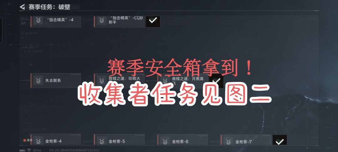 UID:18492041849447151401 TaplD:21136375 S5赛季我也是花了十多天做完了3×3,分享一下完成心得。前期的第一个阶段都是简单任务,我在巴克什做探馆取物的时候所有人都在外围,没人进塔,一个人拉内外闸爽吃。 tips:放置道具的任务是最简单的,利用在选人界面大退的方法,最后七分钟进游戏,玩盾哥几乎没人会浪费子弹追你。前期唯一被卡住的任务是最高通缉,因为做的人多都在抢