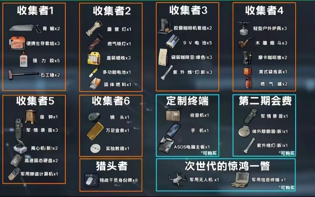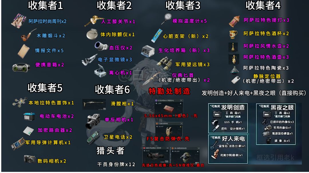 UID∶182249717405575501810 TapID:644186357 【S3焰火赛季3x3速拿直线任务攻略】 收集者提交物品(提前收集) 橙色:非绑定道具提交(必须从局内带出) 蓝色:不限绑定道具提交(可以直接购买等) 1.第一把:机密进图撤离 2.第二把:带射手步枪,清五个机哥(带裸的直接清完自雷)。 3.第三把:带MP5加P90进机密,带任务道具进大坝。先去游客中心交任务,再拿M