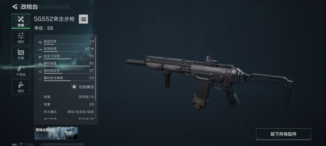 SG552作为一把突击步枪,弹道可能是独一无二的好!900+的射速,配合上625的子弹初速度,让人对它的伤害充满了期待。 然而它躯干伤害19加上四肢伤害15,这样的数值,让它在作战中的实际杀伤效率表现实在是不尽如人意。 所以,如果你枪法好,可以保证打中躯干或者爆头,那它宛如激光一样的弹道,一定会让你爽的飞起,但是要是想用它架枪或者冲锋,那么我的建议是,还是去玩AS吧! 分享码放评论区了#三角洲行动