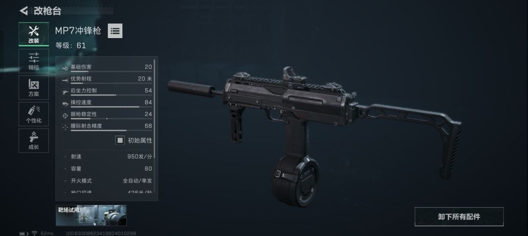 哎~随着一把又一把武器满级,终于轮到了这把MP7冲锋枪。 按照惯例,我们先来分析一下这把枪的优势。 首先,对比一下其他比较热门的几把冲锋枪,它在拥有高射速的同时,还有很不错的弹道,即便选择高操作性改装后,它的后坐力在冲锋枪里,依然算是很好控的,测试10米百血靶,打身体0.3秒,在冲锋枪里也是比较出众的,加上60大弹鼓和消音器,也让这把枪的压制力和隐蔽性也到了提升。 缺点么......怎么说呢?和m