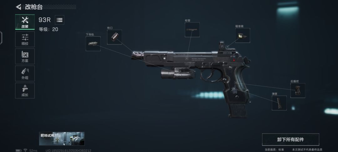 战场手枪推荐 是否觉得g18c削弱后愈加乏力刮不动人? 是否觉得较高的后座力难以控制? 今天带来一把冷门手枪93R 首先看面板 25的伤害 头部伤害31 裸枪优势射程11m 这个数值给的相当之高 三连发的快速连射不管是作为补枪还是作为主武器没子弹的备用武器都是相当强悍的 弱势的地方体现于半自动三连发难以适应以及不够强势的腰射 本次起源测试增加新的枪灯配件提升腰射散步且可以开启战术据枪姿态使93R的