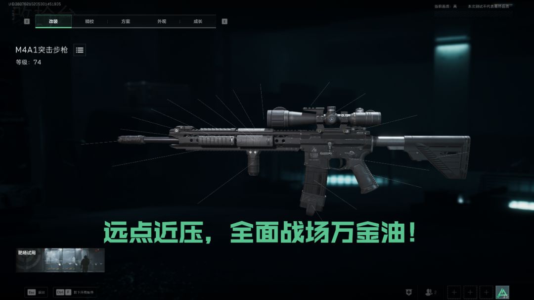 近距离作战老是被杀很难受,动不动就是一通复活没有游戏体验,玩狙击一发一发的打起来不爽?哎!这就要用到万能的改枪方案了!又想远距离突突点又不想玩狙击就来对地方了! 【改枪方案】 M4A1突击步枪-5116089232527511951-全面战场这版方案M4A1核心倾注在全面战场远距离作战。带一个3/7可调倍率狙击镜很合适,中距离连发压一下弹道问题不是很大,远距离调节一下倍镜点人会很舒服。既然用到