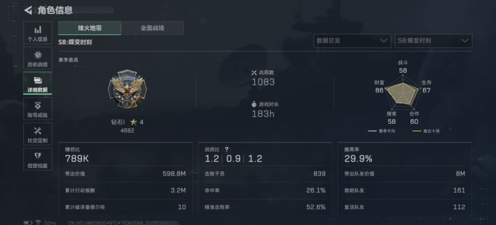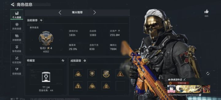 Kd不高。能听懂脚步,听指挥。擅长玩银翼乌鲁鲁,其他工程和信息位也可以。突击位不擅长。不心疼子弹,游戏时间一般为晚上6点钟以后到12点。电脑端ID天下棋子。