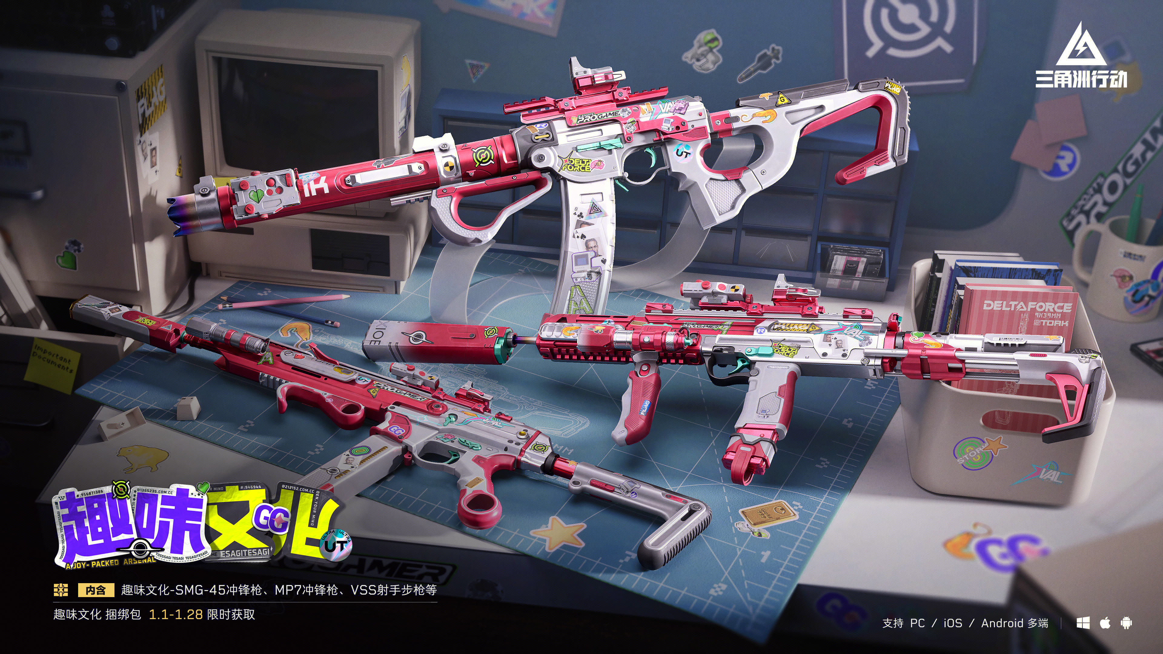 【趣味文化】系列外观亮相!1月1日至1月28日限时上架! 【趣味文化】系列外观以轻松可爱的粉白色为基调,枪身点缀多款趣味贴纸,个性十足。让你在激烈战场中,亦能有专属的轻松一刻。 该系列外观包含:【MP7冲锋枪-趣味文化】、【SMG-45冲锋枪-趣味文化】、【VSS射手步枪-趣味文化】、趣味文化系列喷漆、头像、军牌、挂饰等多样物品!