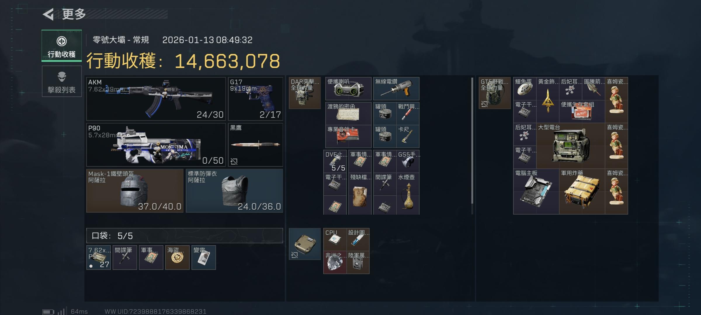 进去做个任务,随便摸了一手电脑,结果出了个曼德尔超算,关键是我就带了把枪,背包弹挂一个没带,而且我也是偶尔玩一玩烽火,也没时间做3×3,还碰到个露娜一个扫描箭,还好有惊无险呀,没扫到我,本来我都放弃了,结果路上打了个小兵有个背包,中途还被追杀了,拖到最后给我跑出来了