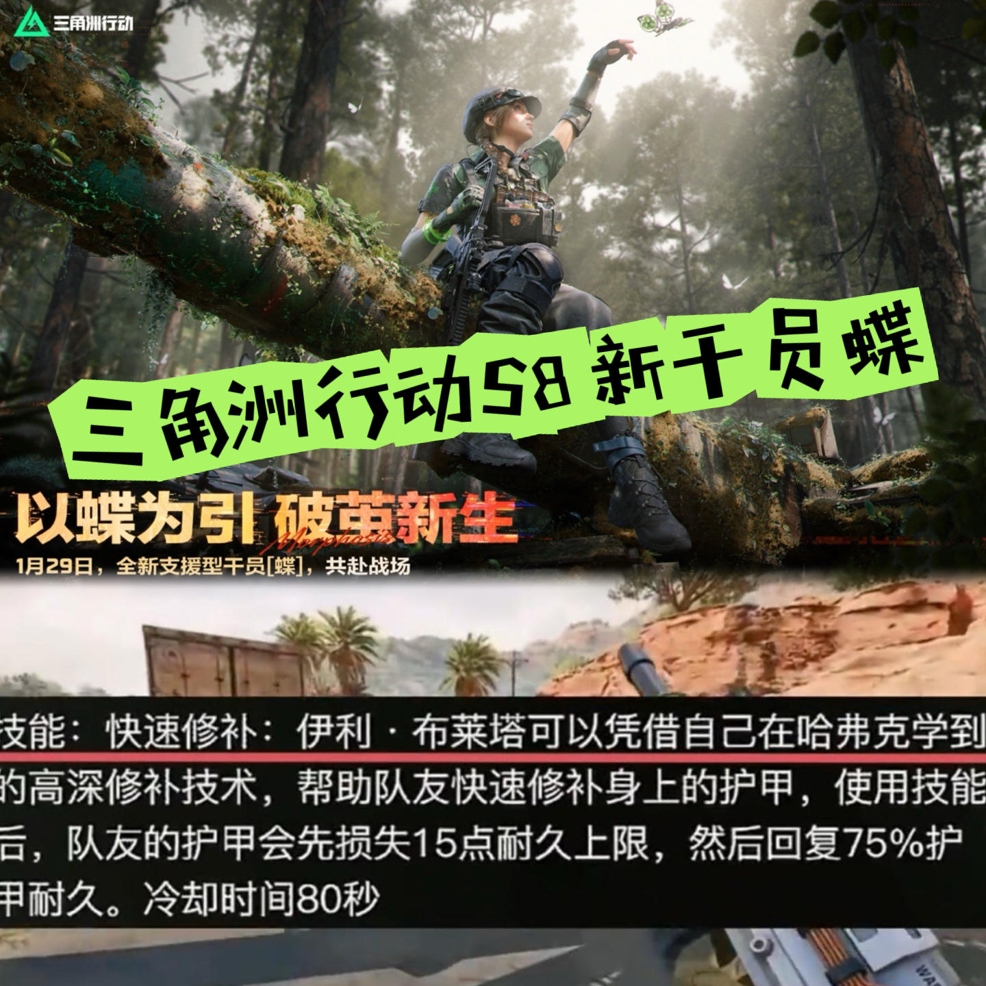 🦋三角洲:新干员爆料!高颜值月底加入由腾讯天美工作室群琳琅天上团队研发,腾讯旗下国民级硬核战术射击游戏 三角洲行动,近日曝光了未来将要实装的全新干员,据悉一位以“蝶”为代号的神秘女性角色,即将加入战场据悉“蝶”的定位是一名支援型干员,根据官方透露的信息内容以及知名博主推测,该干员很可能是一名支援型医疗干员此外官方消息指出,这位颜值颇高的新干员预计将在1月29日正式加入游戏,她的登场或许将