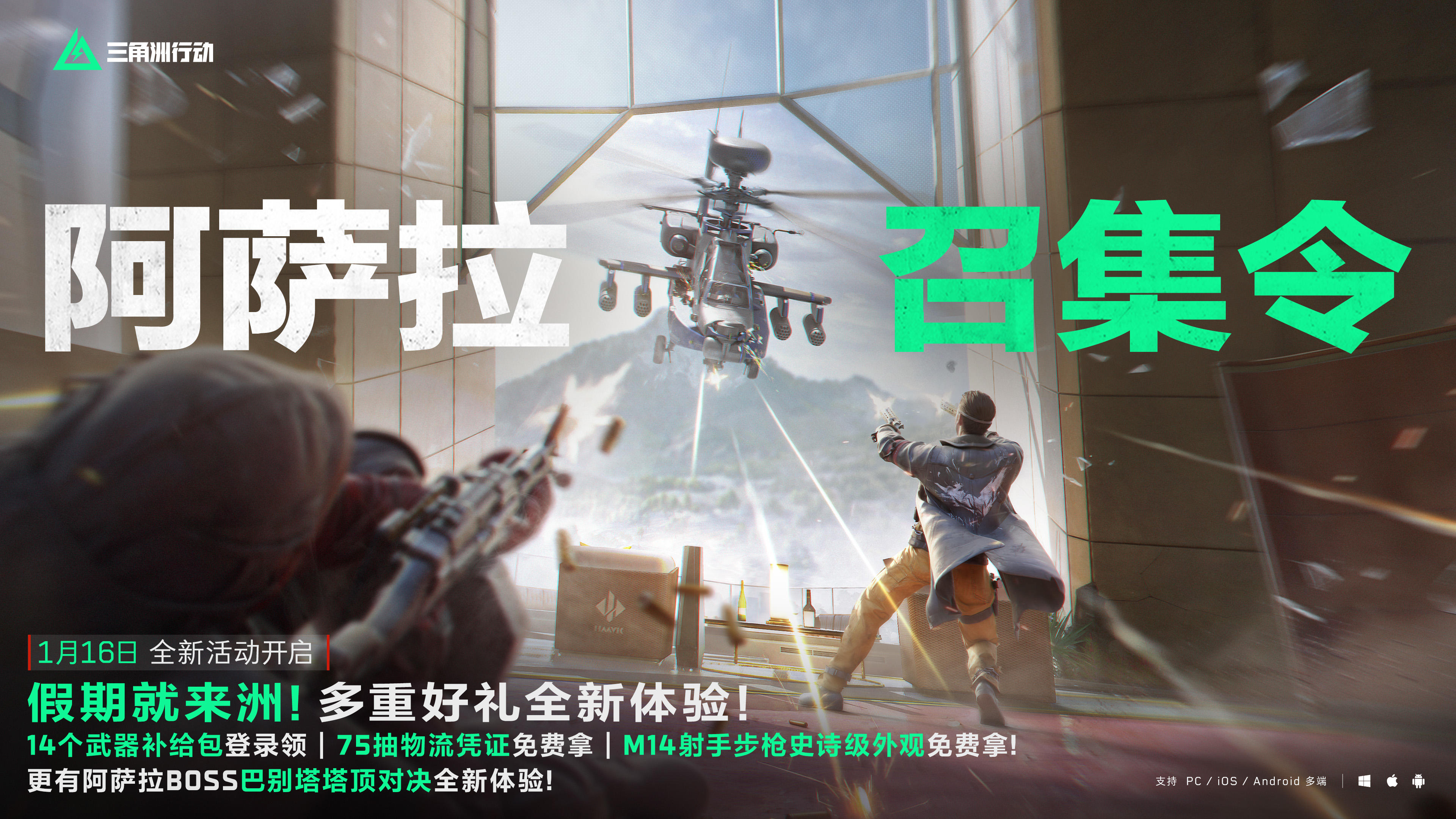 假期就来洲!多重好礼全新体验!1月16日起,每日登录即领14个武器补给礼包,累计登录可得75抽物流凭证,完成任务还能免费获取M14射手步枪史诗级外观等奖励!参与阿萨拉BOSS巴别塔塔顶对决,还有多重奖励等待领取!