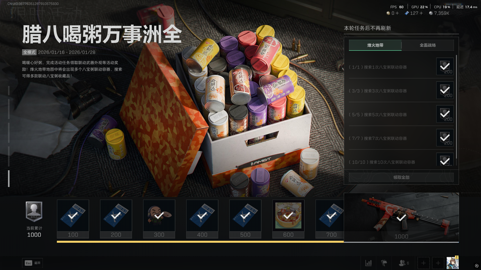 银鹭八宝粥联动限时回归!本期活动时间为1.16-1.28,在各个地图的指定位置会刷新活动容器“一箱好粥道”活动容器只会出联动道具,且必定是9个本期联动可摸到以下联动收藏品零号大坝行政楼东西楼链接处养护站一楼桌上河滩旁边小屋内桌下长弓溪谷雷达站三楼大厅桌上酒店餐厅外边桌上荒村右下角有鸟窝的房子桌上巴克什集市协议箱房内前台上博物馆下方连排房厨房架子上装卸区的右边房间内柜子上航天