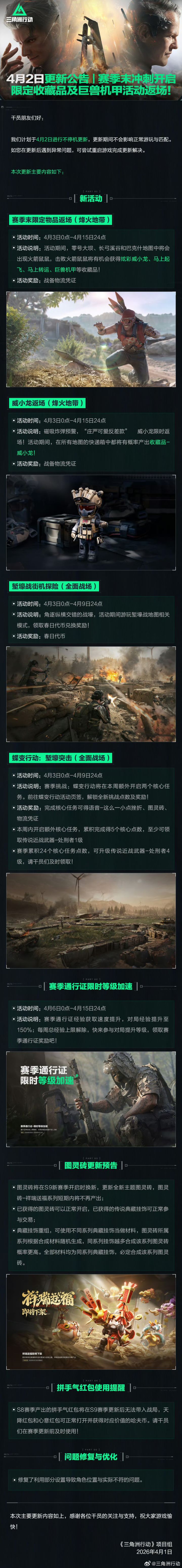 三角洲行动在4月2日迎来新版本更新,这次更新可以说是专门为赛季末收尾准备的,不管是还在冲通行证的普通玩家,还是喜欢收集道具的老玩家,都能找到自己关心的内容。巨兽机甲一直是游戏里人气很高的内容,之前错过的玩家这次终于有机会补上。对于喜欢机甲、追求完整收藏的玩家来说,这波返场真的很及时。赛季末冲刺也同步开启,通行证经验加成、任务效率提升都安排上了。很多玩家之前因为各种原因没来得及打完通行证,这次借