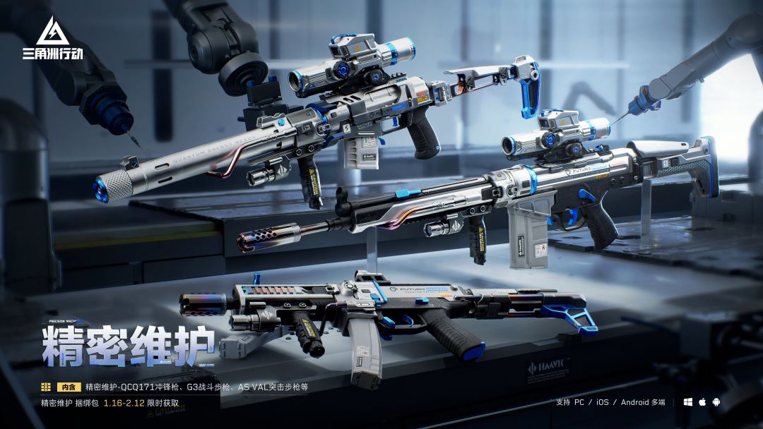 【精密维护】系列外观亮相!1月16日至2月12日限时上架! 【精密维护】系列外观以科技冷白为基调,枪身缠绕金属传导线,赋予武器冷酷质感,助你在激战中始终保持冷静,精准进攻。 该系列外观包含:【AS Val突击步枪-精密维护】、【G3战斗步枪-精密维护】、【QCQ171冲锋枪-精密维护】、精密维护系列喷漆、头像、军牌等多样物品!