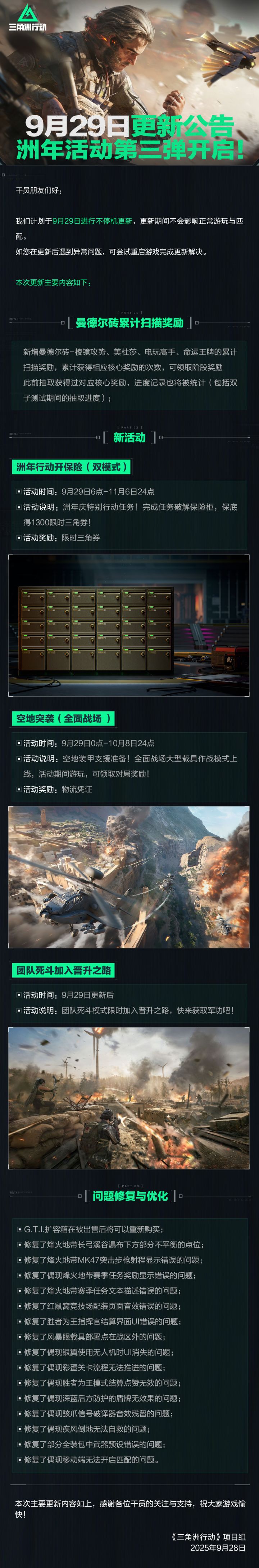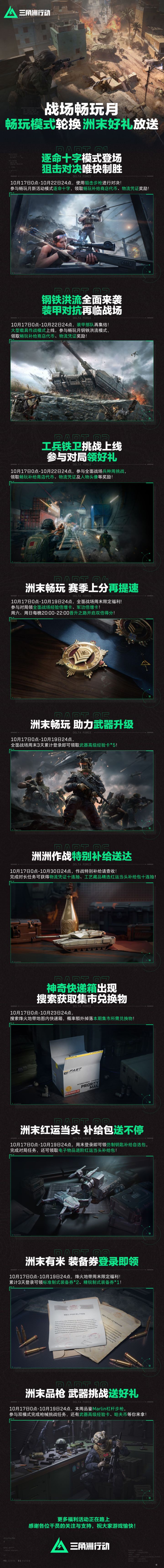 「战场畅玩月」火热进行中! 10月9日-10月22日,箭羽争锋、龙舞惊雷、逐命十字玩法开启!完成活动专属武器外观、专属载具外观免费领! 10月23日-11月6日,多种模式街机轮换开启!每日登录还可领取军功保护卡,前三局不掉分!