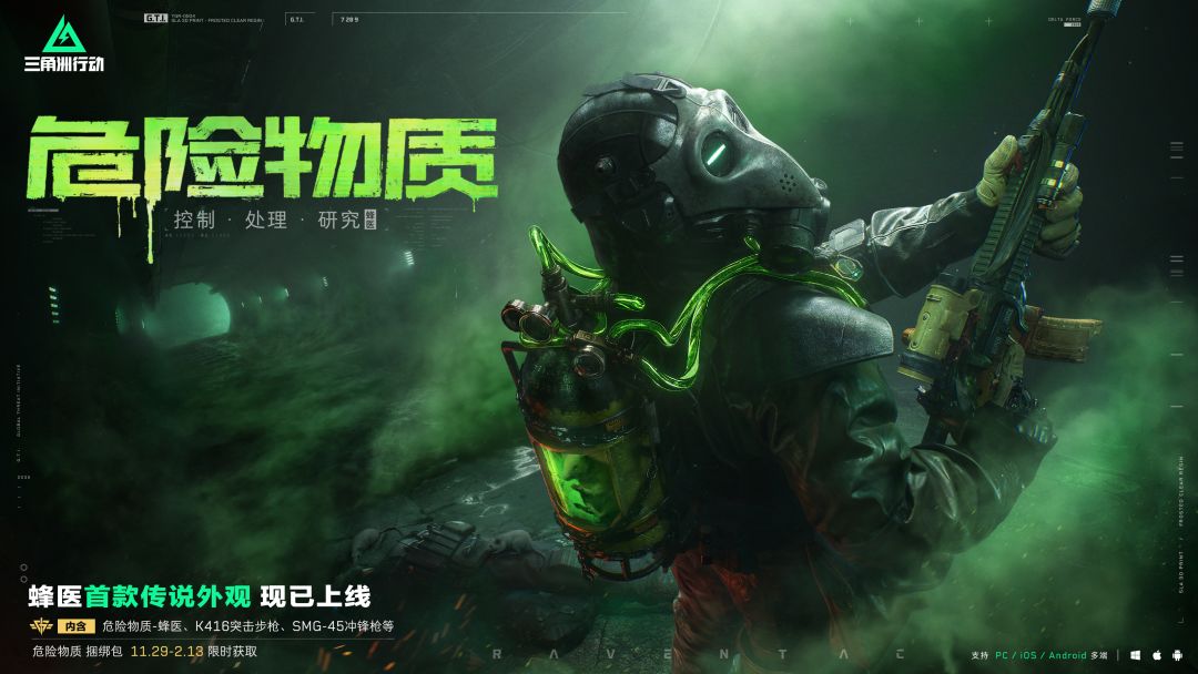 “控制·处理·研究” 蜂医首款传说外观【危险物质】现已上线! 组合包内含【蜂医-危险物质】、【K416突击步枪-危险物质】、【SMG-45-危险物质】及危险物质系列喷漆头像军牌等多样物品! 聚变赛季正在火热进行中!参与对局即可免费领取新干员佐娅及海量版本福利!