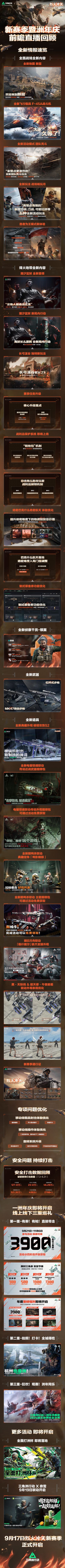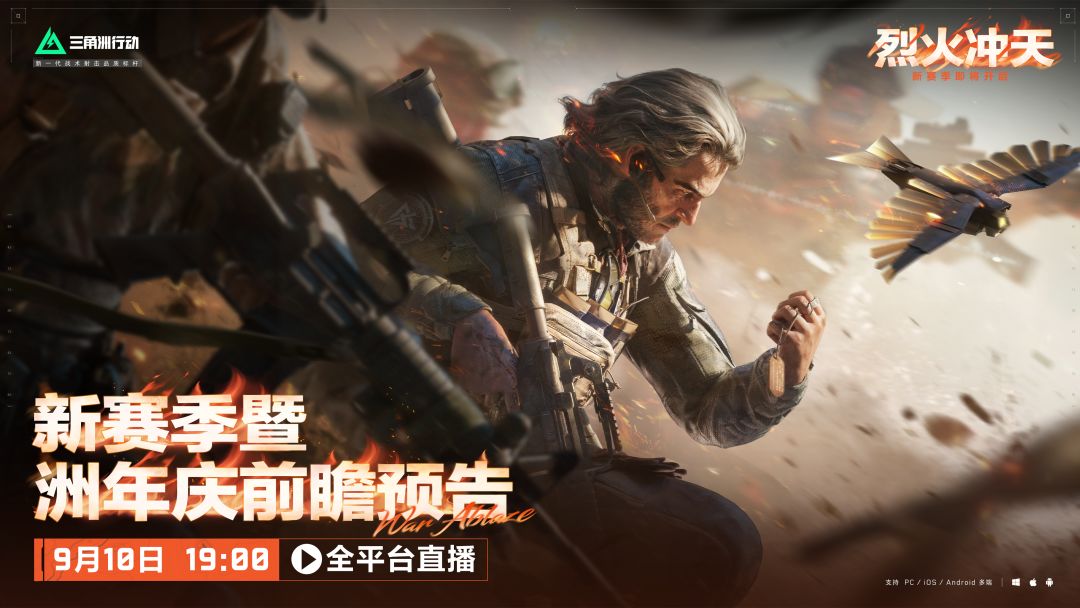9月10日晚19点,新赛季烈火冲天全平台前瞻直播开启! 全面战场新地图断层、全新侦察干员-银翼、全新飞行载具及超多优化内容揭晓! 还有周年庆预热爆料,尽在新赛季前瞻直播! 9月17日 全新烈火冲天赛季正式开启!
