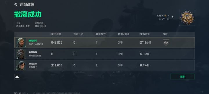 开局打印室上面,我直接冲打印室里面,看有没有火箭燃料,没有,跑出来,趴楼梯下面。20分钟吃东西,吃完牢区,14分钟打算飞升撤,赛季任务需要完成三次标杆,一出门,我和威龙四目相对,威龙和我同时停住脚步,威龙拿枪,我蹦蹦跳跳,然后把东西都脱了,威龙看了一下,应该是被恶心到了,给我丢了个小金。他队友无名和莉娜也来了,无名看了一下,也被恶心到了,MP7,SMG45,都是我摸的裸枪,二弹标准制式券的勇士