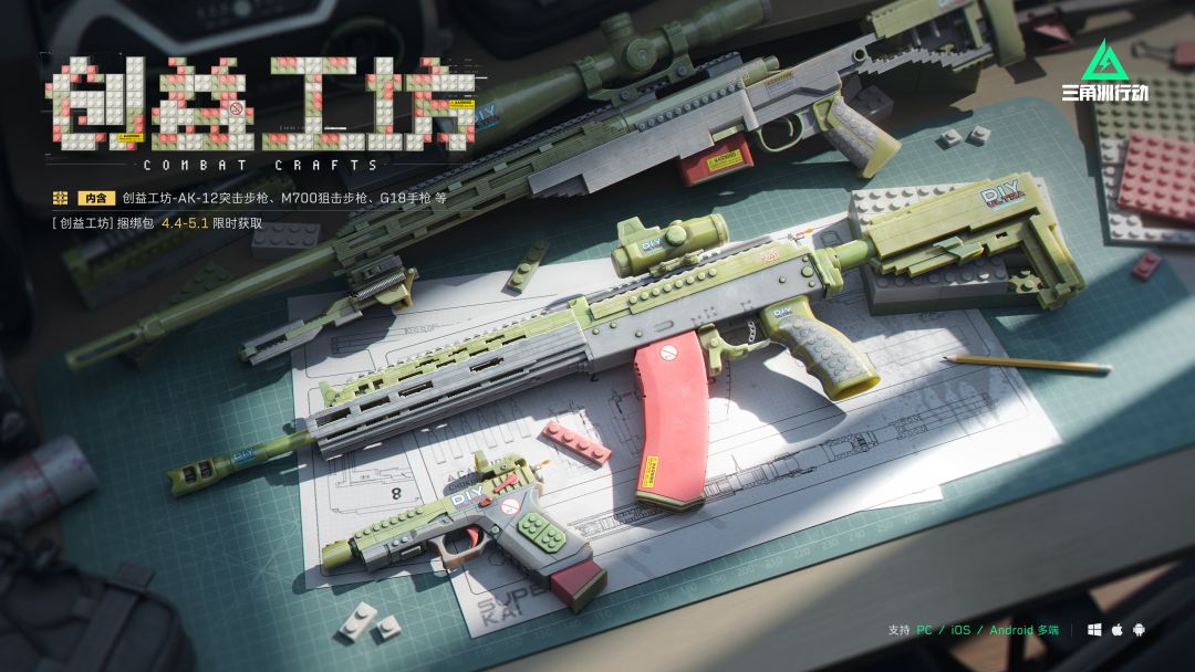 【创益工坊】系列外观亮相!4月4日至5月1日限时上架! 【创益工坊】系列外观采用手工拼装风格,以苔原灰、薄荷绿为主色,枪身通过不同的积木结构精密咬合,细节处点缀柔和珊瑚粉,让每一道手工刻痕都变成自我的艺术表达。 该系列外观包含:【AK-12突击步枪-创益工坊】、【M700狙击步枪-创益工坊】、【G18手枪-创益工坊】、创益工坊系列挂饰、喷漆、头像、军牌等多样物品!
