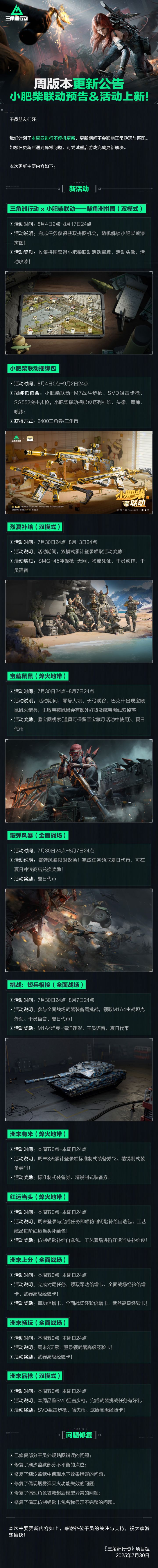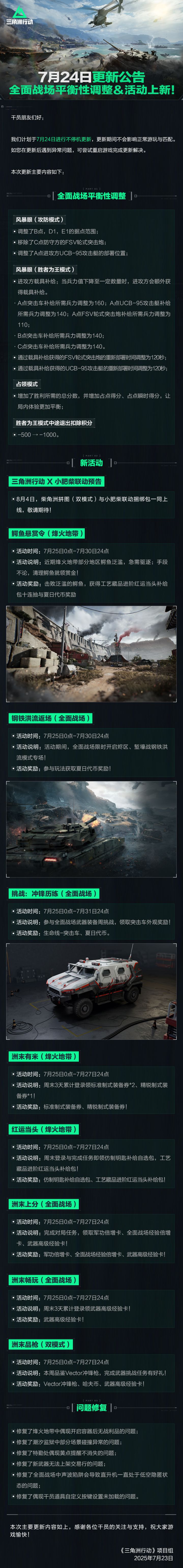 新版本新赛季1月15日正式上线! 有哪些新内容和优化,前瞻直播课代表版速看! 1、赛季任务优化,额外投放限时3x3安全箱!载具手感调整!淘汰回放系统测试版!巴克什开启绝密还减人! 2、新地图、新玩法、新干员、新武器、大坝地下只加面积不加人!海量更新 乐趣加码! 3、春节海量活动来袭!1月24日起,限时3x3安全箱、藏品箱登录送!还有限定大红、春节好运红包!全面战场限时发"红包"模式!这个春节让三角