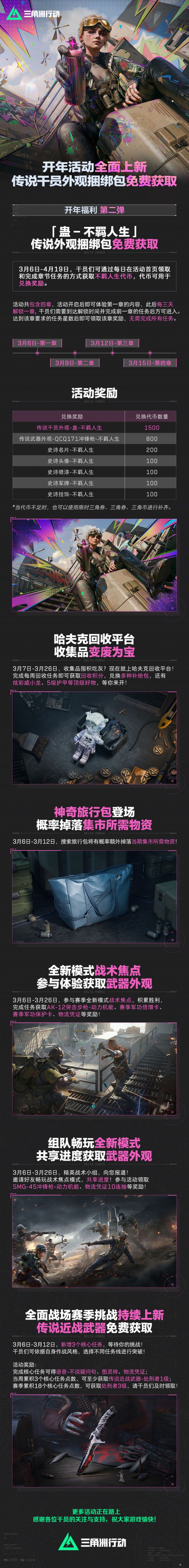 开年福利第二弹,「蛊-不羁人生」传说外观捆绑包,完成活动任务可免费获取!哈夫克回收平台,收集品变废为宝!神奇旅行包登场,概率掉落集市所需物资!全新模式战术焦点,组队畅玩共享进度,一同获取武器外观!全面战场赛季挑战持续上新,传说近战武器免费获取!