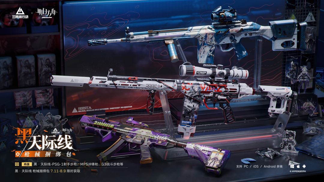 【黑·天际线】武器捆绑包今日上线。7月11日至8月9日限时上架! 【黑·天际线】武器捆绑包中含:【PSG-1射手步枪-黑·天际线】、【MP5冲锋枪-青枳】、【G3战斗步枪-锡兰】、联动角色挂饰、阵营军牌等多样联动物品!