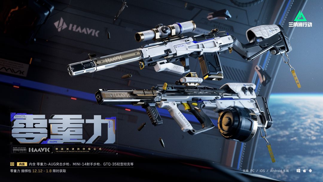 【零重力】系列外观亮相!12月12日至1月8日限时上架! 【零重力】系列外观以充满科技感的冷白色为底,枪口淬炼金属锋芒,搭配亮黄锁扣点睛,整体造型简约、冷酷。让你在每一次交锋中,都冷静如镜,预判先机。 该系列外观包含:【AUG突击步枪-零重力】、【Mini-14射手步枪-零重力】、【GTQ-35轻型坦克-零重力】、零重力系列喷漆、头像、军牌、挂饰等多样物品!