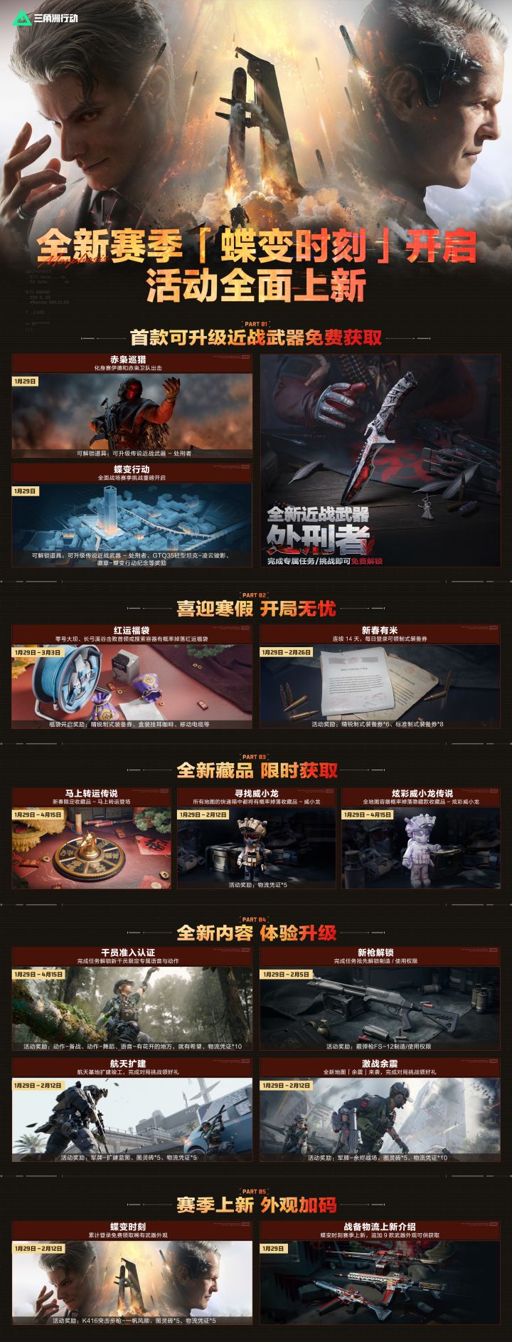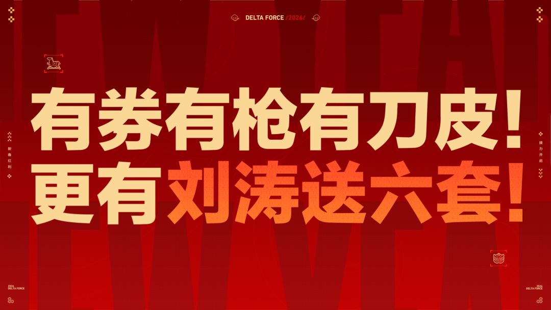 2月10日起,《三角洲行动》新春福利全面开启。 有券有枪有刀皮!更有刘涛送六套! 史无前例的新春福利大放送! 2600限时三角券7天登录送、最多11款传说枪械外观免费得、传说近战参与玩法免费领! 还有六套福袋、新春限定大红、百万哈夫币红包、烟花等道具等你拿!