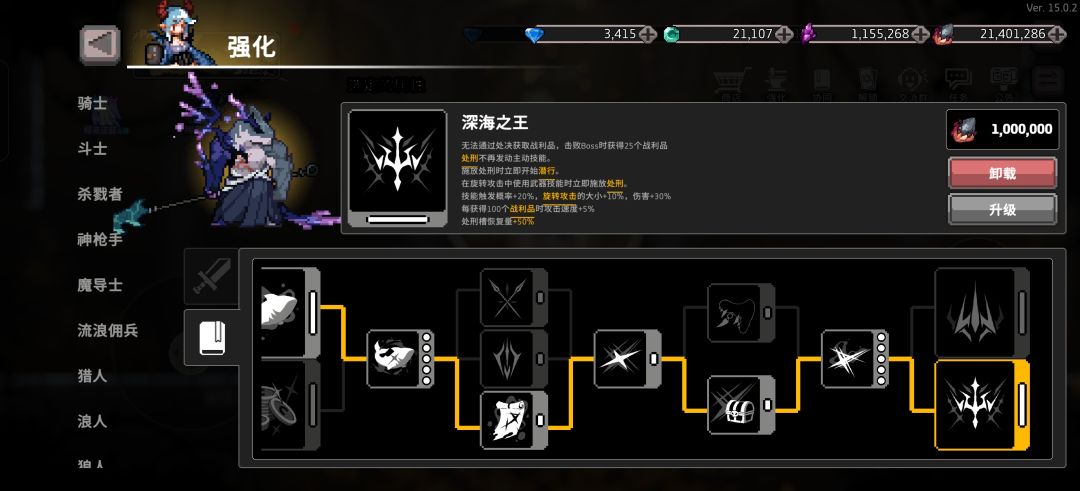 掠夺者 无法获得子技能 (应该是绿色和紫色系的技能表) 技能触发概率-20% 被动 处决:下落攻击和施放武器技能时消耗1格处刑槽能量释放处决并触发主技能 攻击可回复处刑槽能量 每格处刑槽加20%技能伤害 被动 潜行:冲刺会变为潜行,期间回复处刑槽能量,脱离状态会跳起释放旋转攻击(过程中无敌) 被动 战利品:初始上限100点 触发处决有40%概率获得1点 每获得1战利品增加1%处决伤害 每获得10战