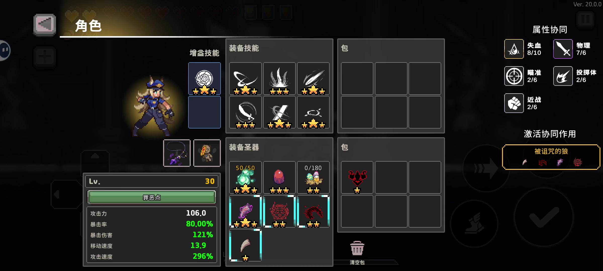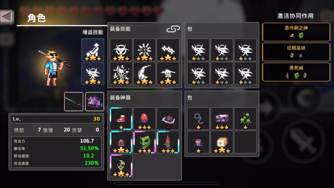 这个预设是根据两个大佬的失血流杀戮者和闪电流斗士总结的,优点是成型快,可以快速叠加失血,基本打第一个BOSS前就可以成型,技能主要升斩剑,其他的就是凑协同等级,没有的话也没啥大问题(书信用完记得扔,苹果在进下一关之前装备就好了)适合前期过渡用