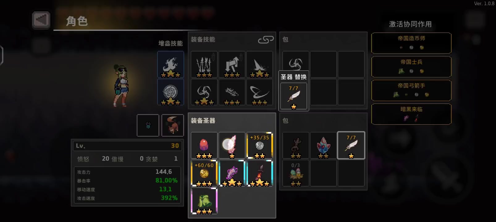 出当天到现在测试了无数打法,最舒服就是血转流了,圣物容易齐,难8(643通关)视频只录了普通版的莫喷✓ 这视频没关特效差点G了[表情_开心] 攻速流双剑术:圣物太费劲,齐了巨爽,可惜圣物占用位置太多,实际伤害有点莫名刮,双剑术可以看我一个专门看圣物的杀戮视频✓ 一拳流:圣物(太阳/陨石/投弹背包/地雷),不用说了,没手套前就是拿来玩的,不过难8前期比黄色闪光过度舒服,走位一拳打死,玩闪的别说斗士,