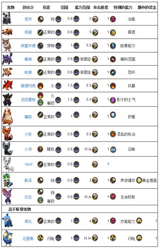 ꧁༺宠物 ༻꧂(3级王殿解锁),可以跟着你的英雄战斗。 他们不被敌人攻击,所以不会死。他们分别拥有不同的普通攻击和特殊能力。 他们的特殊能力是一个循环,持续整个战斗,它的冷却大约10秒。꧁༺野兽 ༻꧂加入联盟后开启(当捐献达到对应数量自动解锁野兽)꧁༺等级 ༻꧂宠物最高等级10级野兽最高等级12级