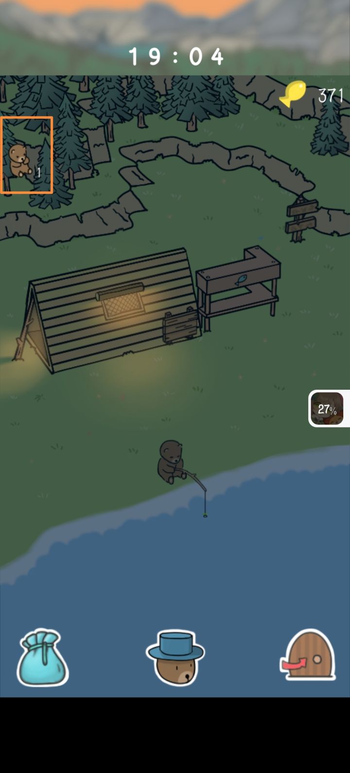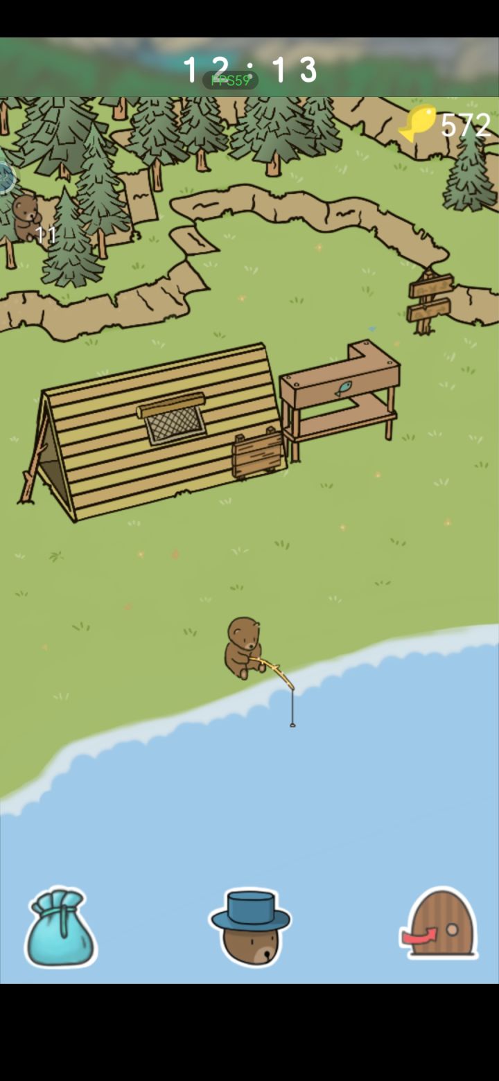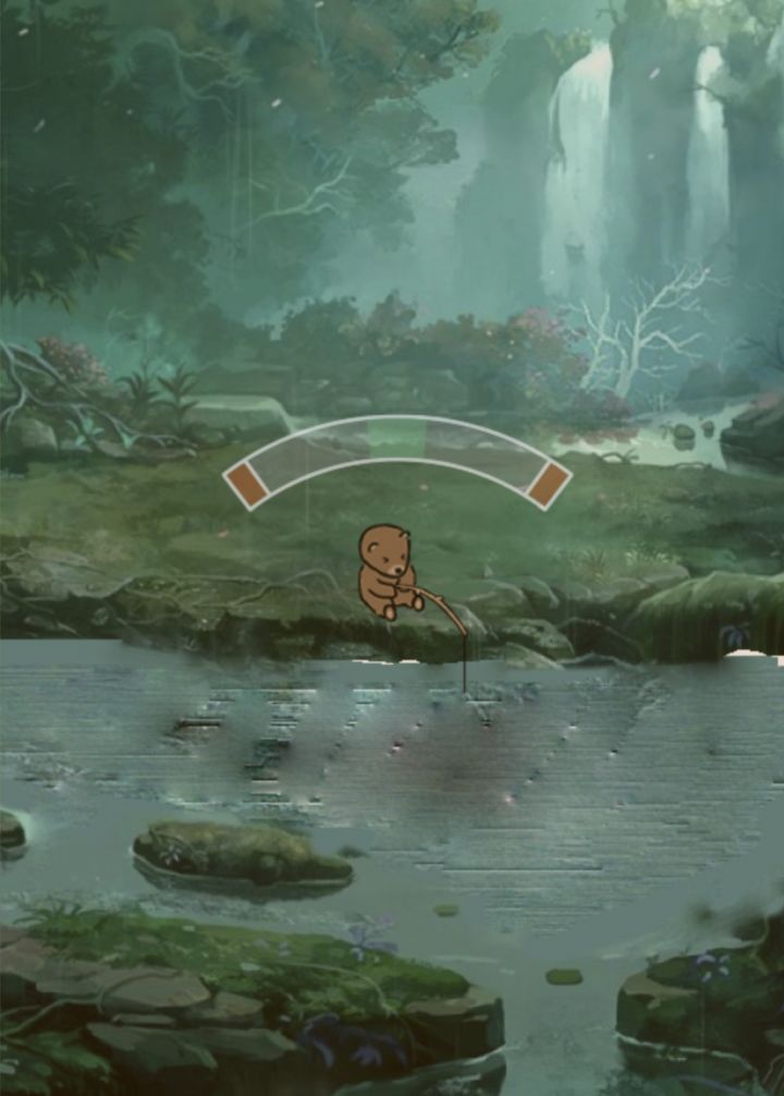 关于钓鱼:点击小鱼符号,开始钓鱼,看见小熊冒叹号了就点屏幕,会打开力度面板,然后你持续点击屏幕让指针保持在绿色区域(可以长按,不用一下一下点击)到达指示条顶端会直接失败
