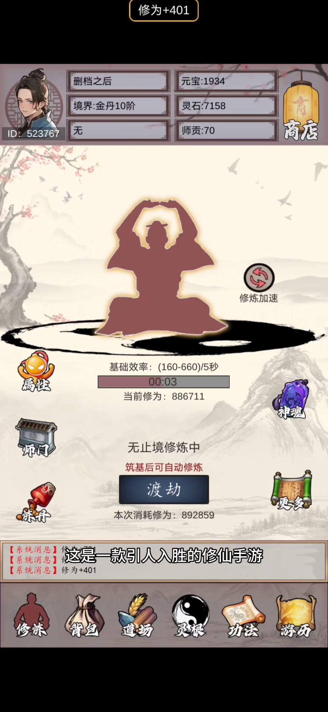 开始进游自己点击修炼,顺便把福利码领了(fuli421,tapxiuzhenzhe)点商店买新法(或者前期可以买一点木材石头铁那些,好直接升级聚灵阵),顺便把师门任务做上,然后有元宝第一时间购入心法,对提升境界很有用处,以上就是我才玩自己觉得的,如果有说错的地方,希望大家理解,毕竟我也是才入坑。