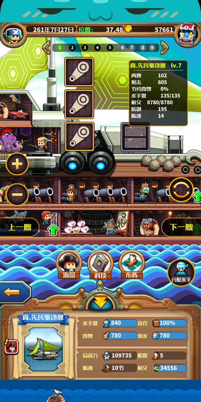 2皇家2盖伦1复仇1先民死活过不去,于是学了科技再上一艘郑和。 原本打的时候掠夺可以撑到结束,但不知道为什么录视频时掠夺死的那么快。 造了3个SS甲板,放在郑和、复仇、盖伦上。3个招的早的接线战专家和杰米6星,其他的船长和水手长3、4星
