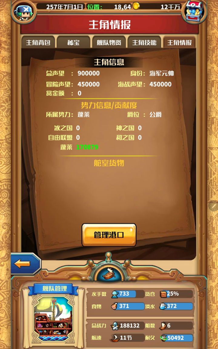 氪了船长、船、搜刮、黄金平底锅、普通素材包,大部分是早年三次重开每次氪一点攒下来的,普通材料主要是为了平底锅,实现主角必须满星的强迫症的自我满足。256年拿下了除了漩涡北海以及绯红西南的C港、拿下了2级章鱼和1级海蛇,完成北海前的全部支线任务和大妈任务,探索全部村庄,拿下大小姐和薇薇安。也有两处失误,实在没有动力去回档了:第为了加快进程一次搜刮给了钢锭造S炮最佳方案应该搜刮牙齿的,漏了宝蓝西北的