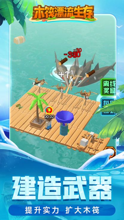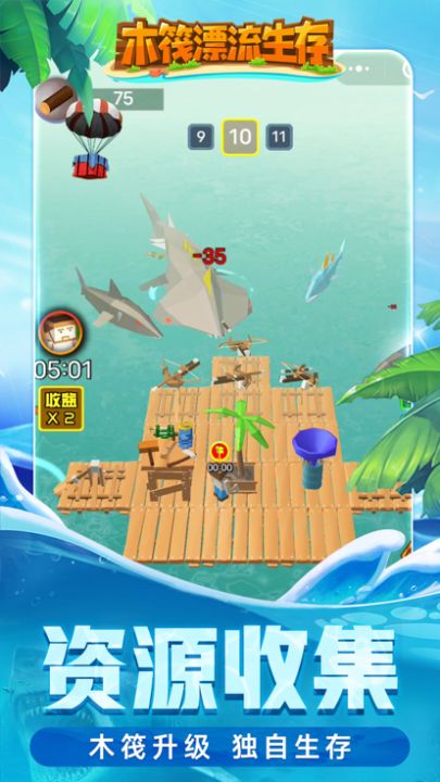 在充满神秘和危险的海洋中,你一无所有。如果想生存下去,你必须收集资源,砍树、收集木材、建造新的筏子、钓鱼、种植水果和蔬菜。对了,还要小心鲨鱼袭击吃掉和攻击你的筏子!!但是不要担心,你结交的动物朋友会来帮助建造新木筏的。空中飞翔的小海鸥,它们往往会带来幸运和希望哦~