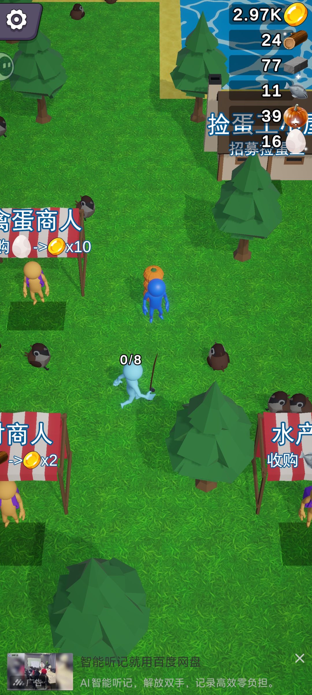 鸡蛋在右上角。 渔夫在右边。 采石在右下角 农夫在左下角