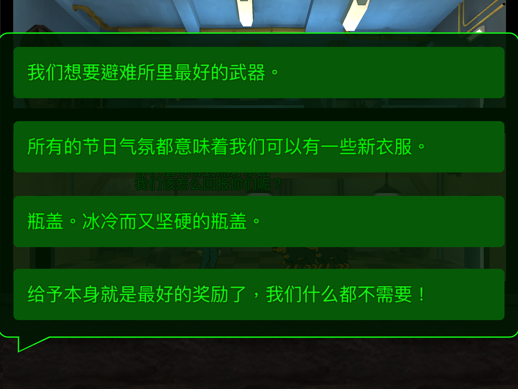 从孩子世界抢过来的 完成系列任务奖励: 获得瓶盖和瓶子报答,他们会随机拜访玩家的避难所,在他们跳舞的时候点击,有可能获得核子可乐(跳舞时,点击瓶盖一定会获得瓶盖,点击瓶子有一定概率获得核子可乐,也有可能是瓶盖) 原子的春天 做完整个系列的任务会给一件金色衣服和一个乘四废土返回速度的狗。