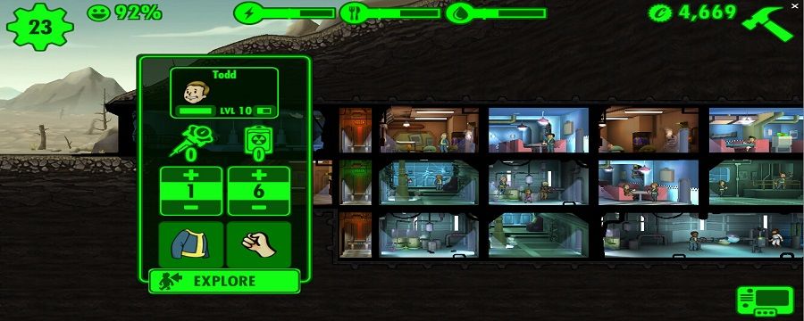 辐射避难所中,可以游戏中建立一所自己的避难所,使用避难所中的各种设施来获取资源或是遣避难所里的居民去外界获取素材。废土,处于避难所大门外,废土探险需要先选好去废土探险的居民。不同属性居民探索会得到不同属性的东西。属性可以在居民列表中找到。也可以在房间中根据居民特长选择。其次,直接将选好的居民拖到避难所外面,待弹出探险版面,调整装备和所带药品,就可以点击探险出发了。 居民在废土中进度是看不到的。可