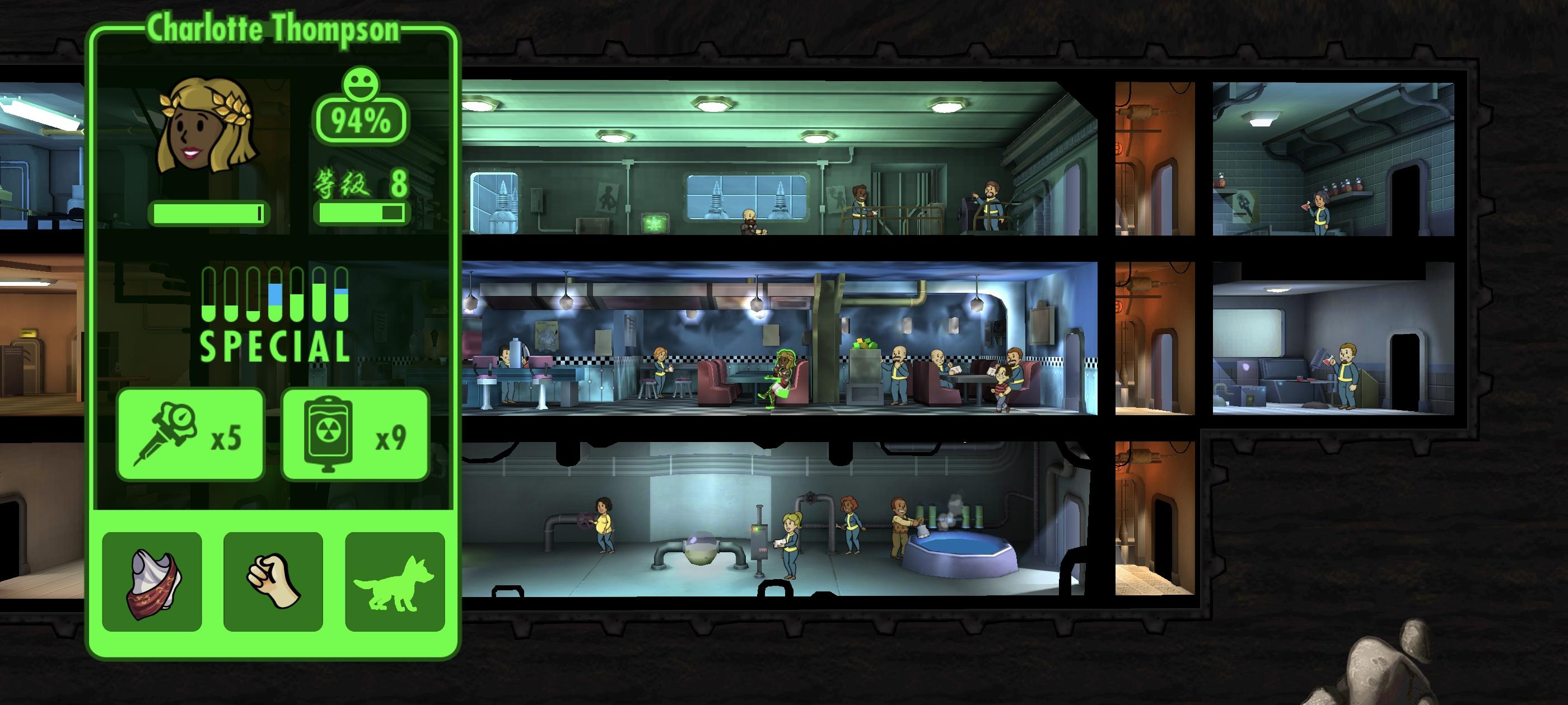 幸存者模式难点就是人一条命,各种突发事件死爪、辐射蝎子、火灾等,只要能抗住快速解决就能安然度过。布局为前四层生产建筑,隔一层中间训练建筑不要相连,两个小人的房间处理突发事件是最快最简单的,死爪、辐射丧尸就在前四层解决。仓库、房间、医院、科学院建立在最底层,各种突发事件不用管自己会消失,上面要隔一层。重要的属性E抗辐射S电量A食物在35人口时就训练高,ES“AL”属性尽可能高拉出去搞资源,药品不够就