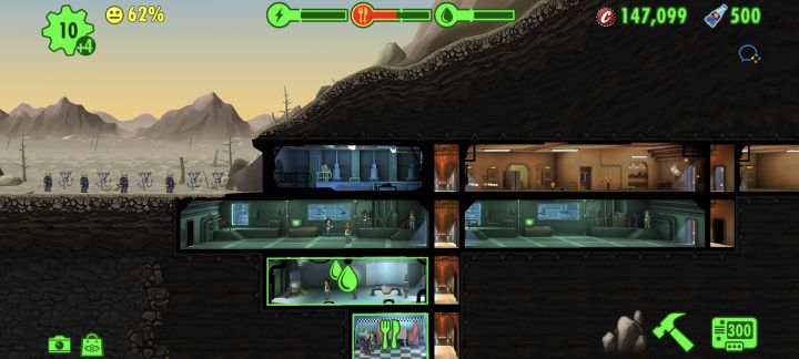 所有房间运行都需要电力,电力不足将无法训练、打造、生产等,所以要保证足够的电力,主要有两点:1.生产力,就是人,我现在有10个小人生产电力勉强够用,后期需要还会增加,因为现在有6个都去生产传奇武器加特林,所以估计需要25-30个S小人2.房间。一是房间数量,没有需要的房间暂时不要建造,平白增加电力负担;二是仓库这种不需要电力的房间放到最下边,即便电力不够,也不会影响仓储数量;三是升级(这点很重